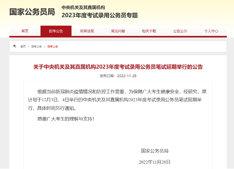11月28日,国家公务员局发布公告,根据当前新冠肺炎疫情情况和防控工作需要,为保障广大考生健康安全,经研究,原计划于12月3日、4日举行的中央机关及其直属机构2023年度考试录用公务员笔试延期举行,具体时间另行通知。