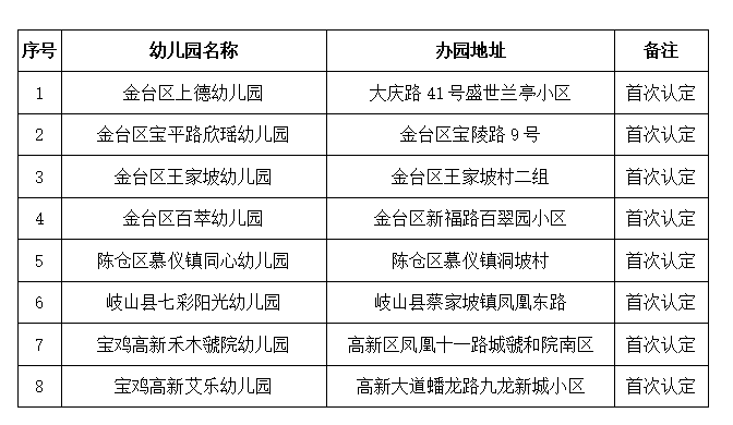 根据市教育局、市物价局、市财政局《关于印发<宝鸡市普惠性民办幼儿园认定及管理办法实施细则>的通知》(宝市教发〔2017〕485号)精神,在幼儿园自愿申报、县区初审、市级审核的基础上,拟认定金台区上德幼儿园等8所幼儿园为普惠性民办幼儿园。现将名单予以公示(见附表),公示日期:2022年8月2日至8月9日。广大人民群众若对认定结果有异议,请在公示期内以口头或书面形式向市教育局基础教育科实名反映。
