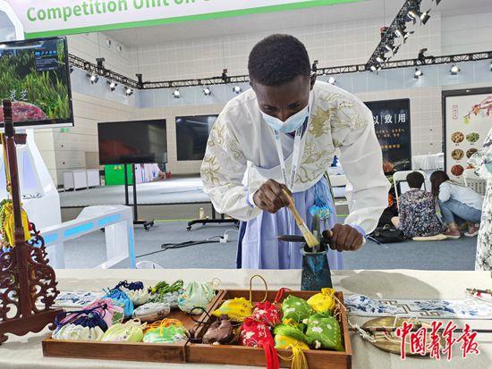 外国选手在制作中药香囊。中青报·中青网见习记者 杨洁/摄