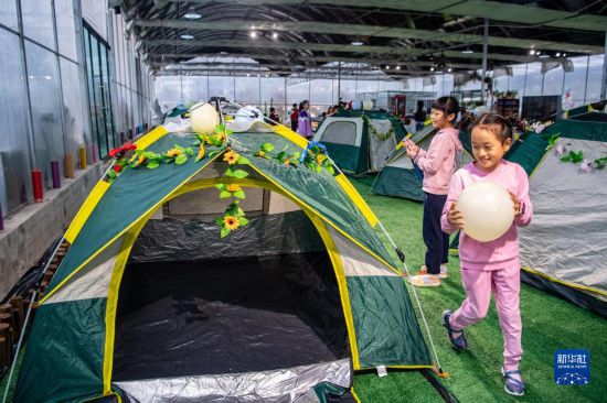 10月5日,在天华百卉园内,小朋友在布置帐篷。