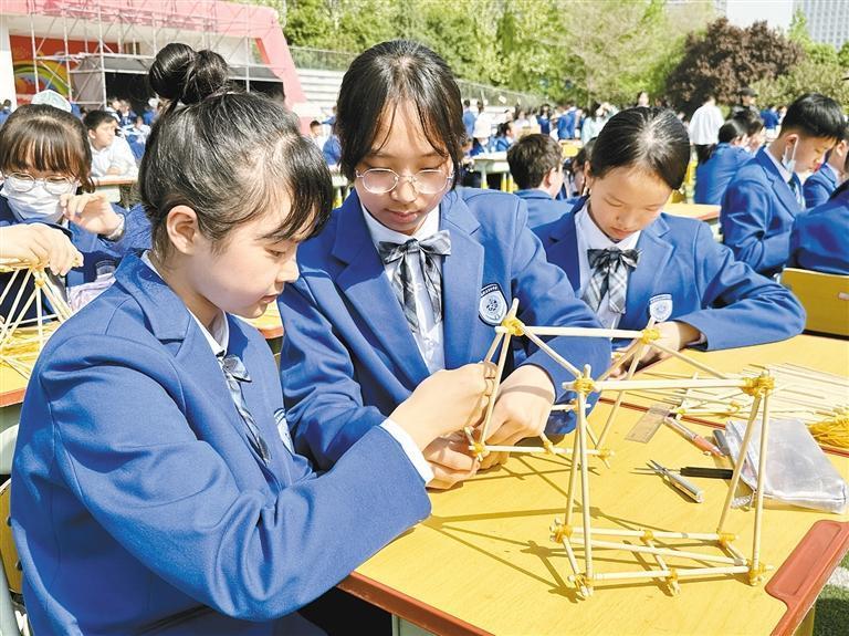 西安高新逸翠园中学科技节上,学生们正在做筷子搭桥承重实验。