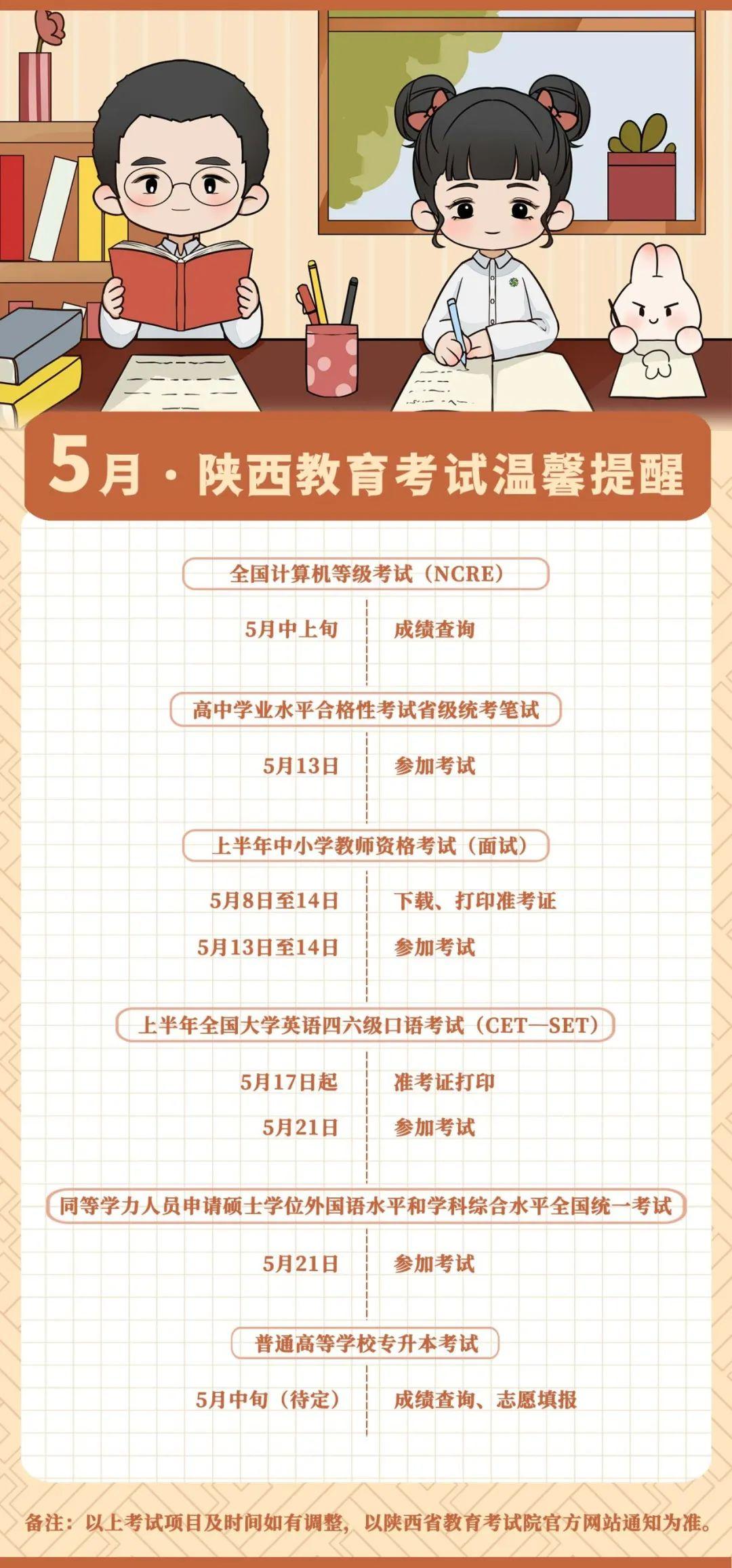 5月5日记者从陕西省教育考试院获悉,本月将有四项考试开考。省教育考试院为助力考生顺利赴考,按照时间顺序为大家整理好了本月需要关注的考试事项,希望学子们考试顺利。