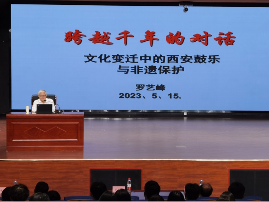 西安音乐学院教授罗艺峰为大家带来了专题非遗讲座——《跨越千年的对话:文化变迁中的西安鼓乐与非遗保护》。罗教授是中国音乐学院博士生导师,国家有突出贡献专家、享受国务院特殊津贴,教育部学术学位评议专家,人文社科奖评审专家,长江学者评审专家。在讲座中,罗教授从什么是非物质文化遗产,以及我国的非物质文化遗产的基本情况介绍讲起,生动形象地为大家讲述了西安鼓乐的起源与发展,并联系文化变迁理论和我国非遗传承保护政策,强调保护、学习、传承这一珍贵历史遗产的价值和意义。