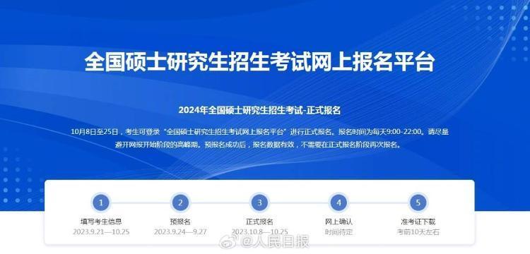 10月8日至25日,考生可登录“全国硕士研究生招生考试网上报名平台”进行研招统考网上正式报名,报名时间为每天9:00—22:00。