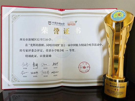 西安市新城区后宰门小学小水滴合唱团,在本次合唱节精彩亮相,饱含深情、富有活力地演唱了两首作品《山河已无恙》、《地球大合唱》,以全国第二名的好成绩喜获小学组一等奖,获得专家评委的肯定与好评。